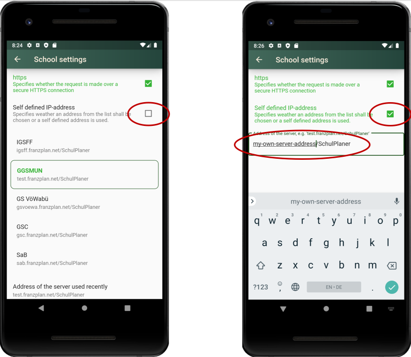 Hier kann die Adresse des Schulservers aus der Liste der vorhandenen