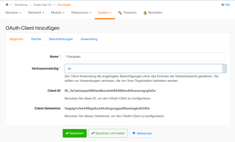Die Client-ID und das Client-Geheimnis werden vorgegeben. Beide Einträge